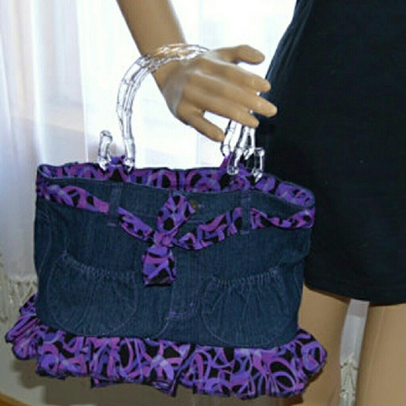 Dark blue jean purse accented with purple/black swirl print ruffles & decorative plastic handles. Usable pockets!
