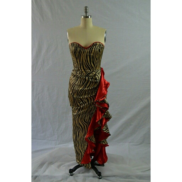Animal print satin long evening dress. Champagne and black strapless tiger gown with red accents, large ruffle & high slit. Prom or party