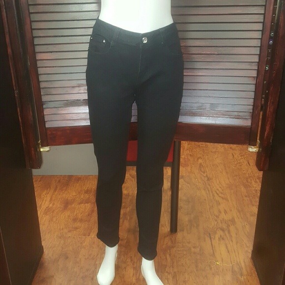 Black skinny leg jeans sexy stretch fit with rhinestone design on pockets and front button is a rhinestone