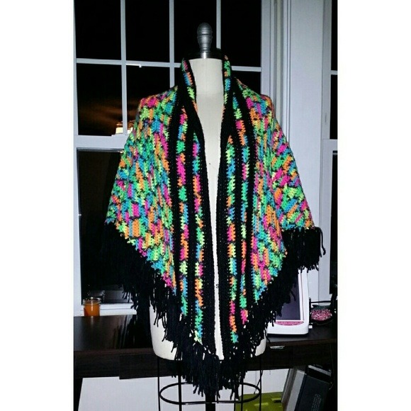 Rainbow yarn crochet shawl. Hand made crocheted shawl in neon rainbow colors with black piping and fringe edges