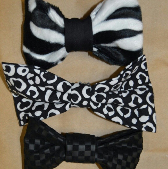 Handmade hair bows. Set of 3. Handmade by me, all brand new with tags. All have alligator clip backs. Fuzzy zebra print with black knit center, measures 5" across. Black and white heavy cotton leopard print, measures 5.5" across. Black checkered faux leather and velveteen, measures 4.5" across.