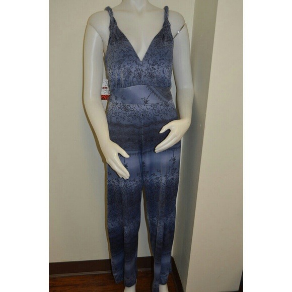 Perfect for summer! Blue stretch knit jumpsuit. Ombre denim shades with floral lace print in navy. Sleeveless twisted straps. V neck front and back. Wide waistband for definition. Straight leg pant. Back zipper. Bust: 36" Waist: 30" Hips: 40" Inseam: 31" NWT handmade by me. Amazing with jean jacket and sandals