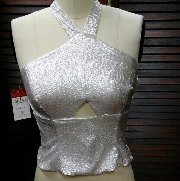Super cute top for parties, clubs or raves! Halter front with strappy back. Keyhole under the bust in the front. Fitted top with underbust seam, slight flair from there. Side zipper and hook and eye closure. Buttons around back of neck. Silver holographic stretchy ripple textured fabric. Lined in light nude stretch fabric. Bust: 28" Waist: 25" has a little stretch all over. Handmade, NWT, never worn