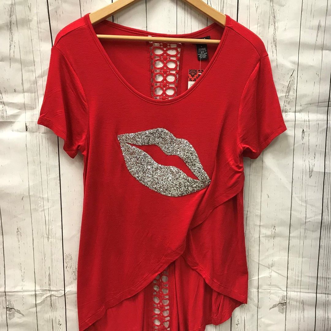 Valentine’s Day Rhinestone Kiss Crochet Crisscross Front and See-Through Back Shirt