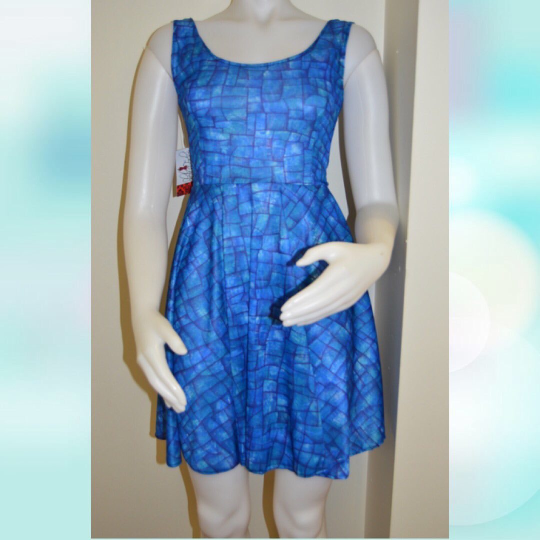 Stretch knit geometric pattern blue knee length skater dress. Sleeveless summer/spring dress in shades of blue mosaic tile print