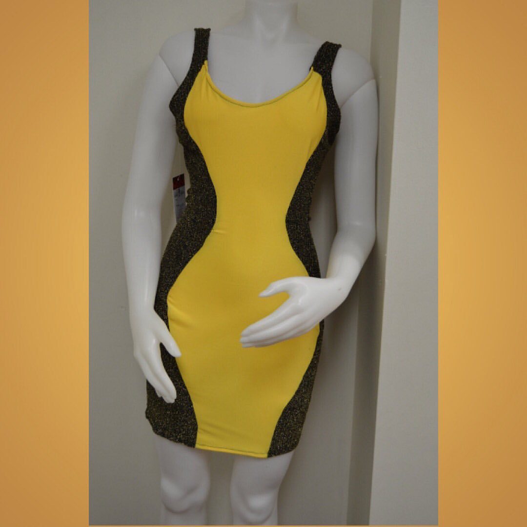 Yellow, black and gold metallic stretch knit bodycon sleeveless club dress. Short mini body hugging dress hourglass accentuate!