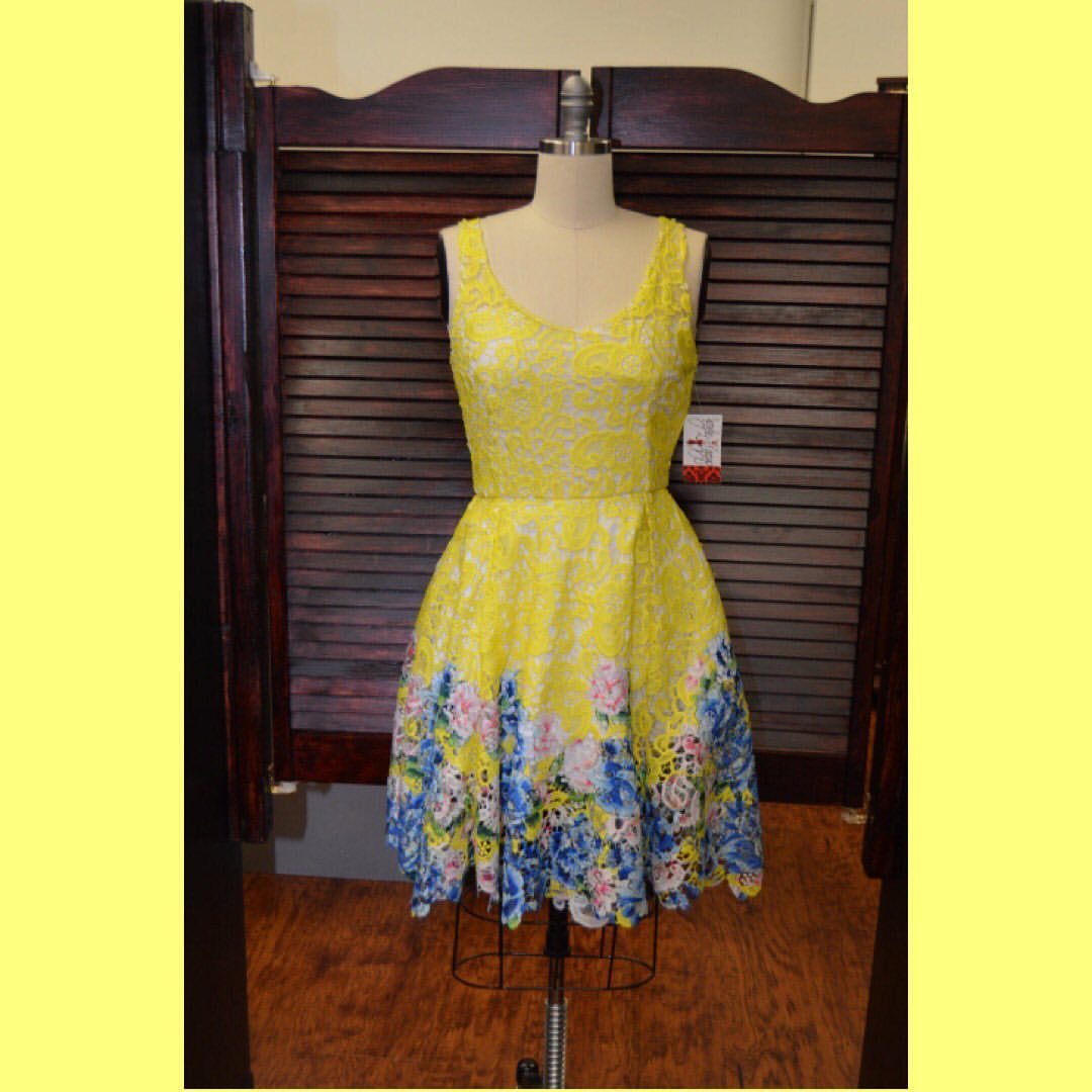 Sleeveless yellow lace dress with multi-colored border. Knee length floral summer dress with unlined sheer back. Flirty and fun!