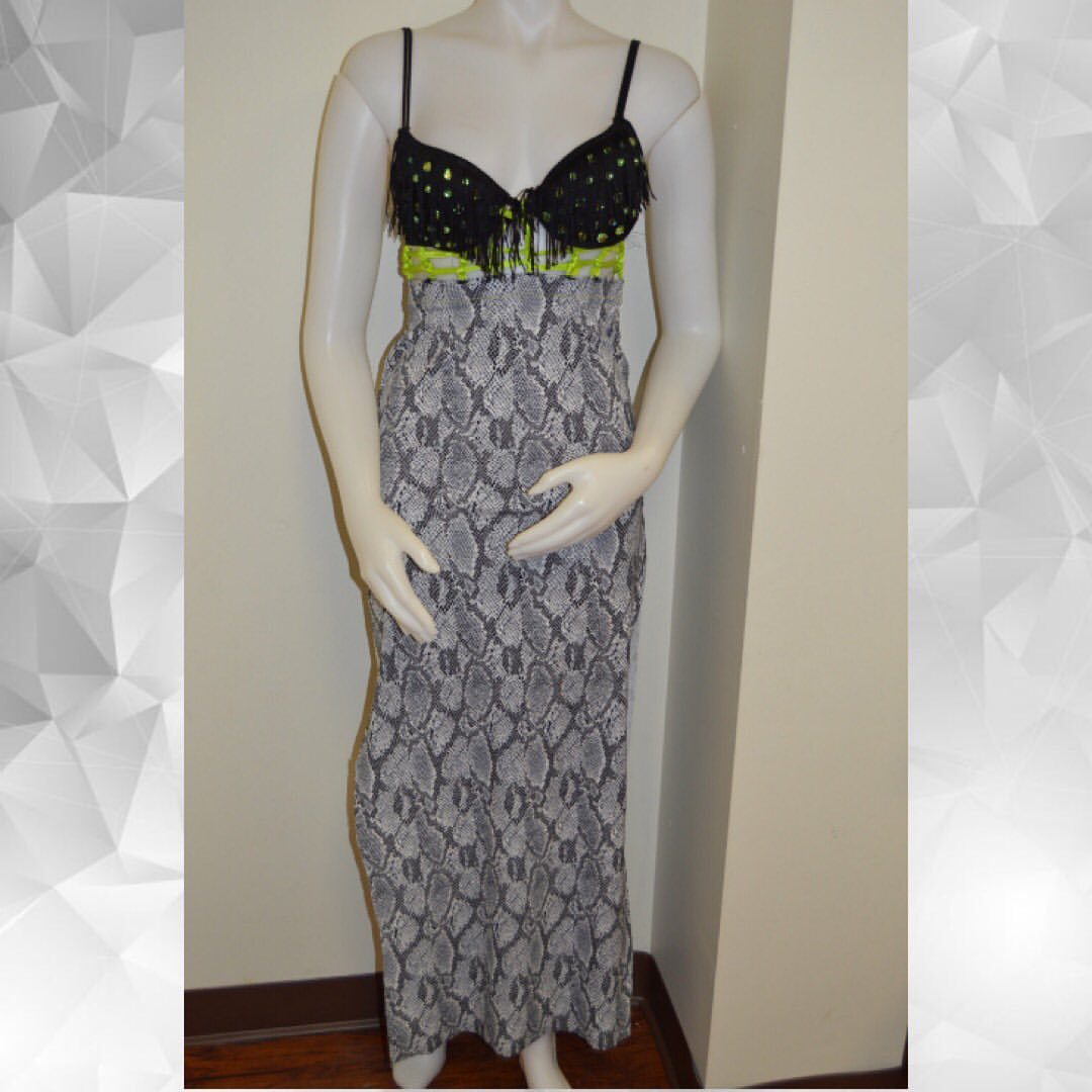 Sexy snakeskin print stretch dress with lime green cut out midriff and fringe and rhinestone embellished bra top. Club/costume performance