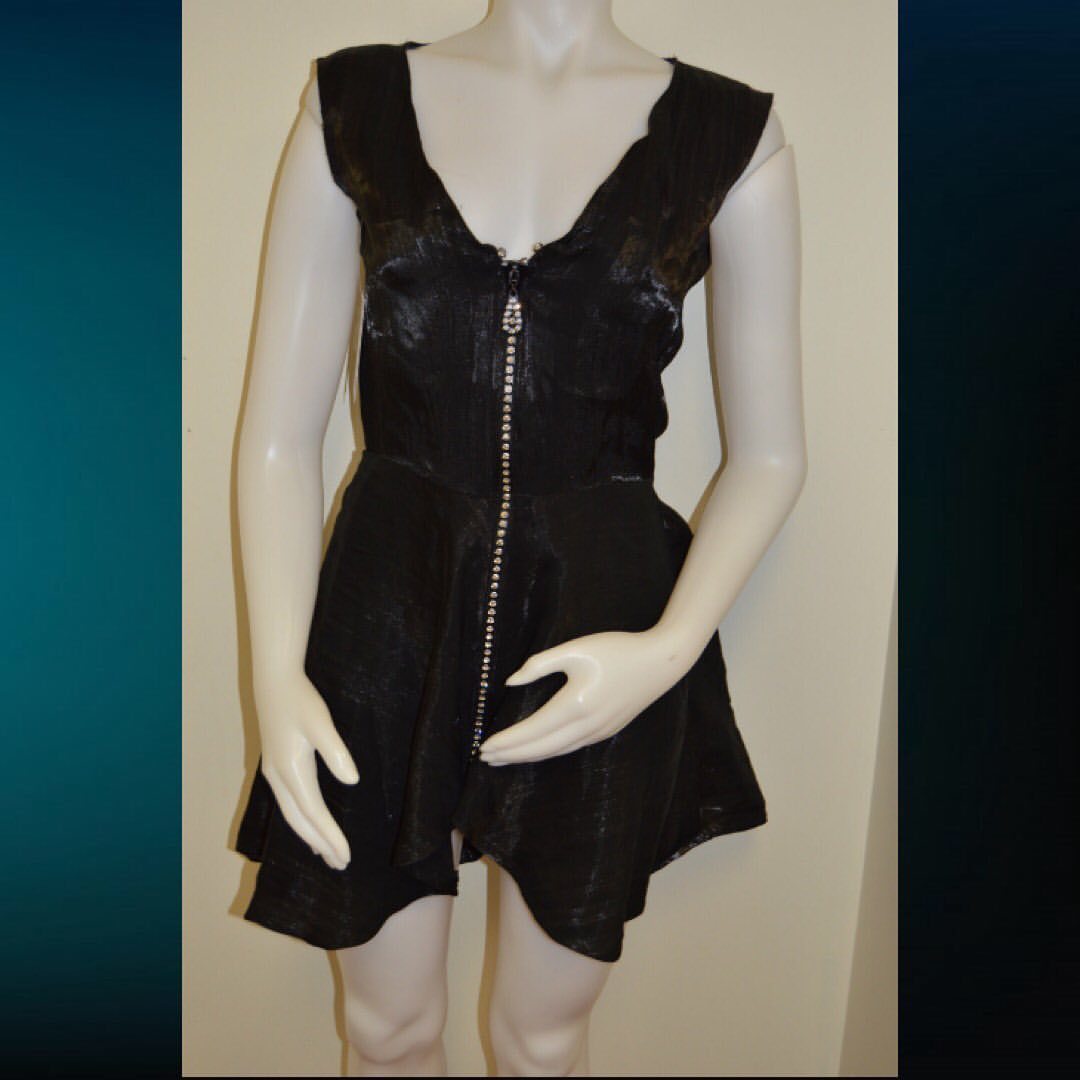 Soft black metallic crepe fit and flare sleeveless short dress with rhinestone decorative front zipper. Everyday sparkle and fun