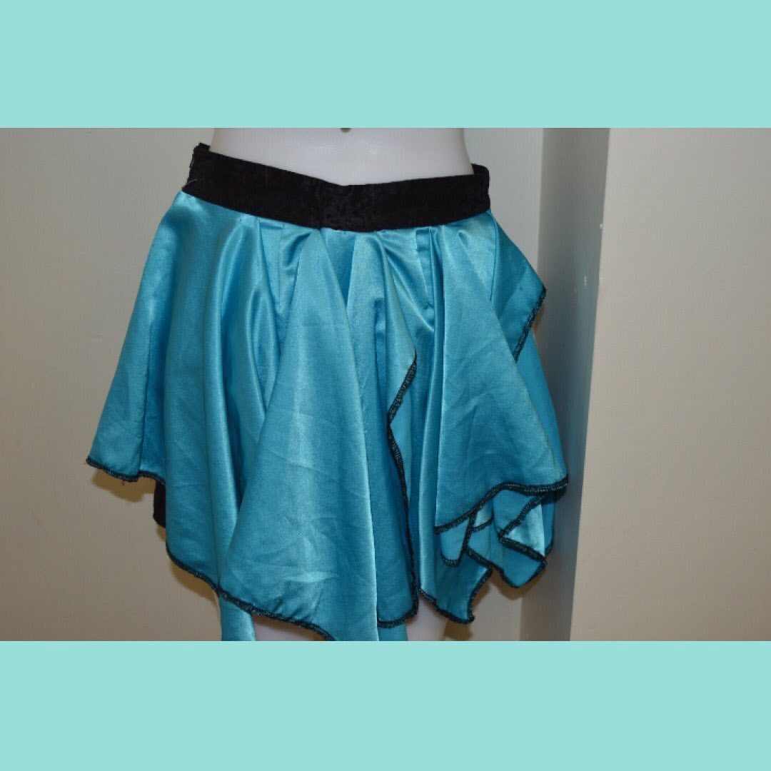 Turquoise satin handkerchief short skirt with black leopard print taffeta accents. Girly sexy separates for party or costume fun